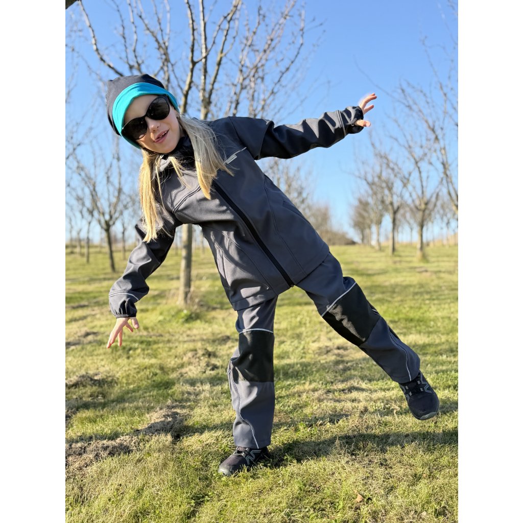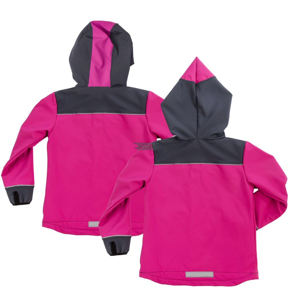 Dětská prodloužená softshellová bunda s kapucou, reflexními prvky a dírami na palce. Vysoce kvalitní softshell. Možnost zakoupení v soupravě.